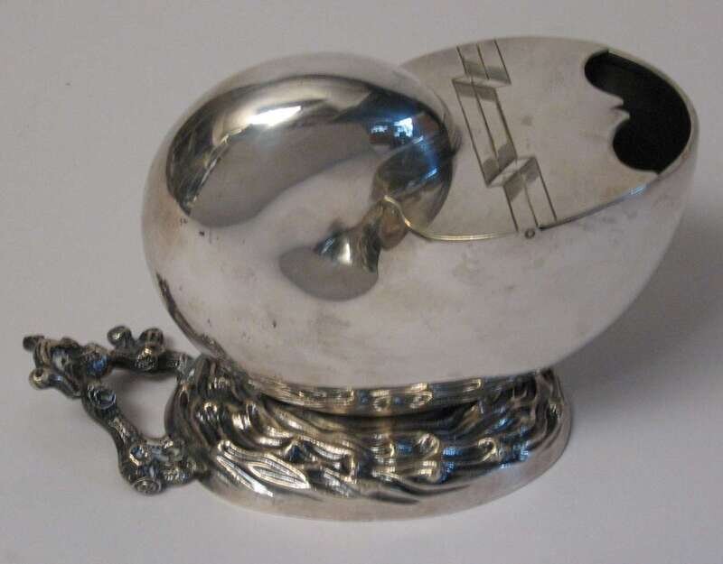 In the form of a nautilus shell, raised on a rockwork base with a coral form handle.