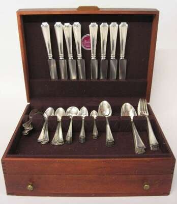 Comprising 8 dinner knives, 8 butter knives, 8 dinner forks, 8 tablespoons, 12 bouillon spoons, 13 teaspoons, 6 grapefruit spoons, 12 demitasse spoons, 4 serving spoons, 2 meat forks, a sauce ladle, a cheese knife, a cake server and a tart server, monogrammed 'RPJ'. (85).