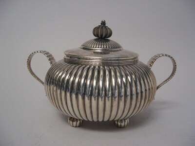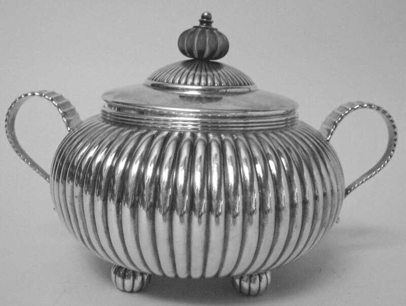 Of ovoid form with a treen knop and reeded decoration, raised on conforming bun feet, monogrammed and dated 1881.