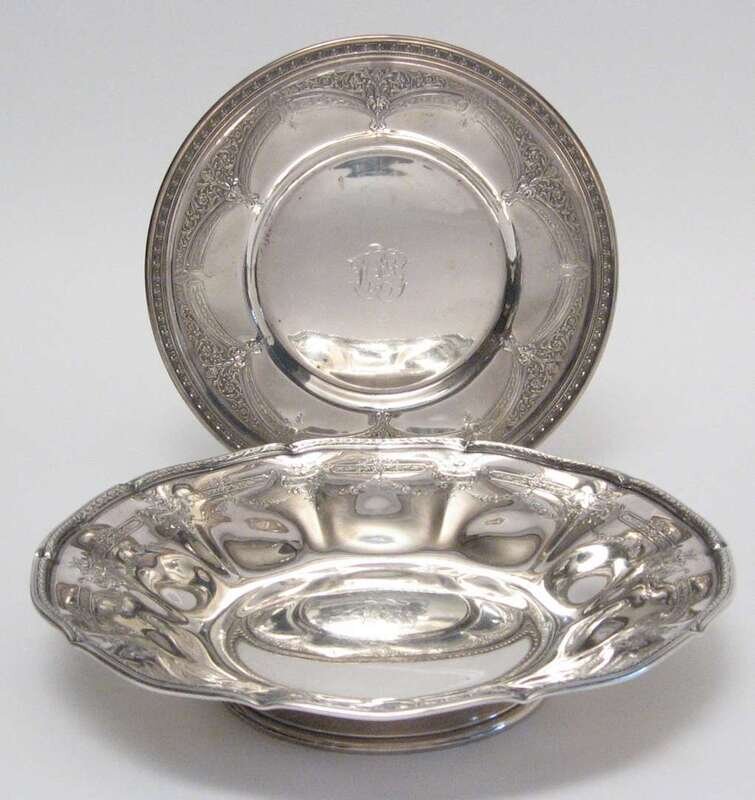 The wide, sectioned rim decorated with engraved floral swags and with a ribbon-tied molded edge, on a circular foot; together with a Towle sterling silver plate with scrolling decoration, both monogrammed. (2).