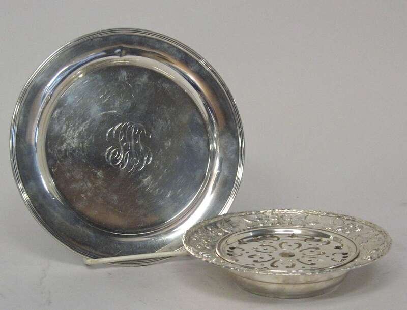With a floral repousse border and pierced insert, monogrammed; together with a Shreve, Crump & Low underplate, monogrammed. (2).