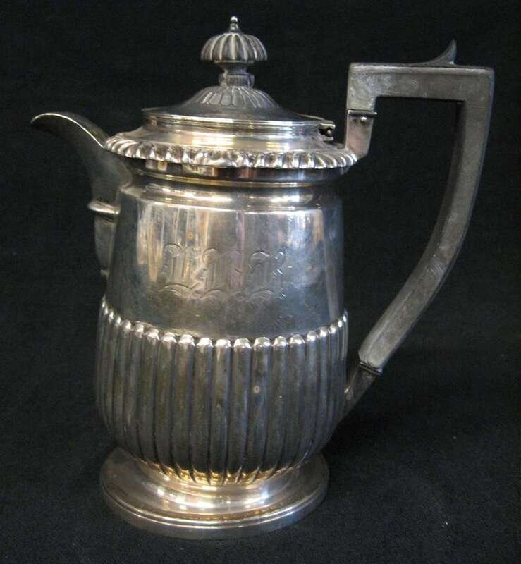 With a gadrooned rim and reeded body, ebonized handle and finial, monogrammed.