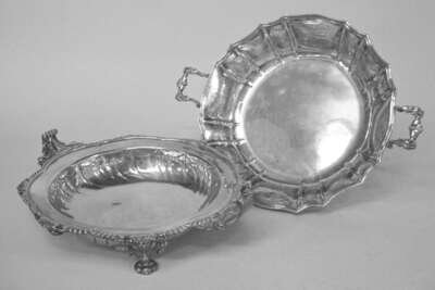 The first example with a gadrooned border and upturned scroll handles, raised on paw feet, retailed by J.E. Caldwell & Co., the cover lacking; the other Continental example of lobed circular form having a gilt wash interior with chased decoration and outscrolling open handles. (2).