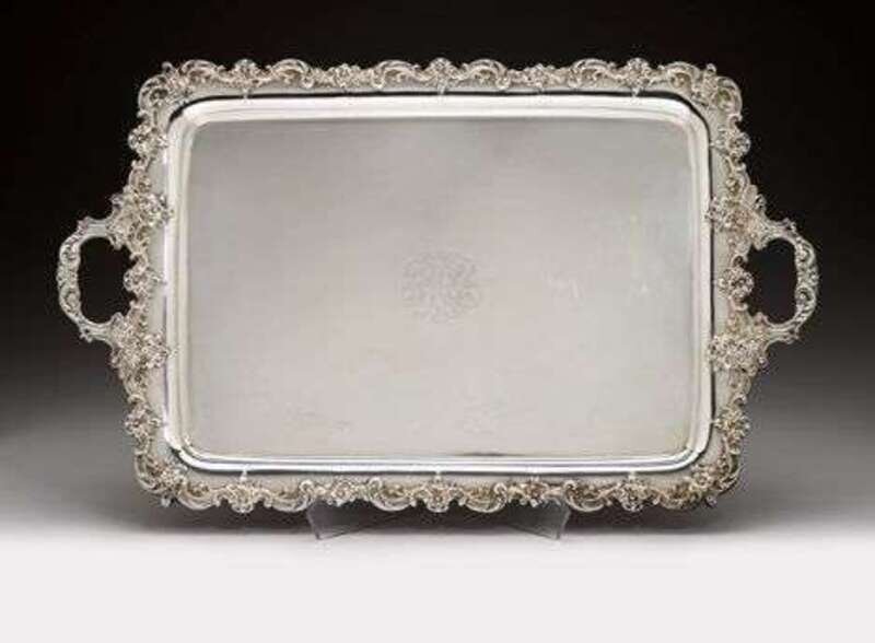 Of rectangular form with a scrolling floral cast border and open carrying handles, monogrammed.