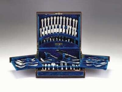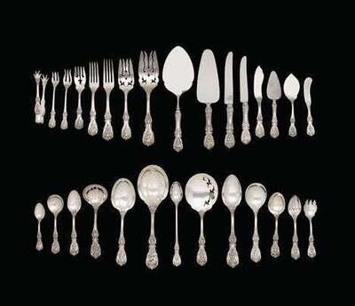 Comprising 12 dinner knives, 12 luncheon knives, 12 butter spreaders, 12 dinner forks, 12 luncheon forks, 12 dessert forks, 12 oyster forks, 12 ice cream forks, 12 cream soup spoons, 12 bouillon spoons, 12 grapefruit spoons, 12 teaspoons, 12 iced tea spoons, 12 demitasse spoons, a cold meat fork, 3 tablespoons, a serving spoon, a cake server, a tart server, a cheese server, 2 butter knives, sugar tongs, a sauce ladle, a tomato server, a jelly server, a pickle fork, a sugar spoon, and a pair of salad servers, in a fitted mahogany case. (186).