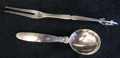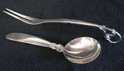 Including a 'Cactus' pattern condiment spoon and a 'Leaf and Berry' pattern sliding pickle fork. (2).