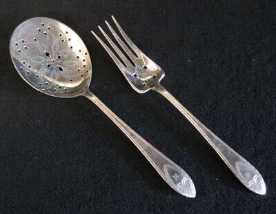 Comprising a large fork and serving spoon, each reticulated and monogrammed H.