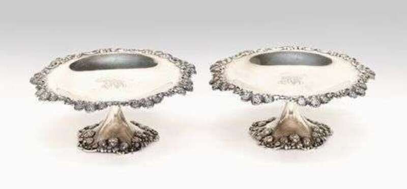 Each with strawberry-cast border, raised on a circular foot, monogrammed.
