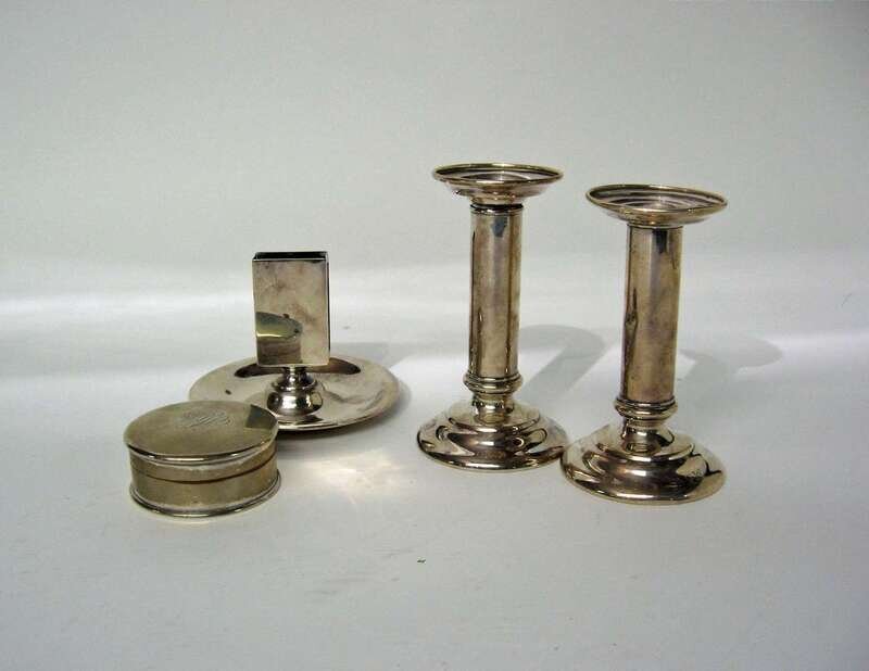 Each of upright form, monogrammed AGW; together with a Tiffany & Co. silver plate circular box and an American sterling match box holder. (4).