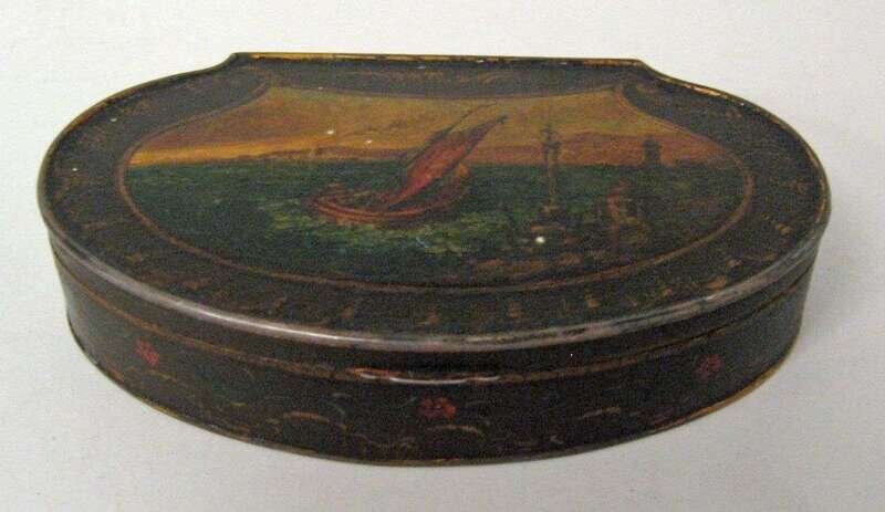 Of shaped oval form, the hinged lid painted with a coastal scene, the underside painted as a shell with a rose and anchor center.