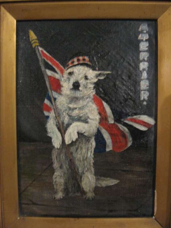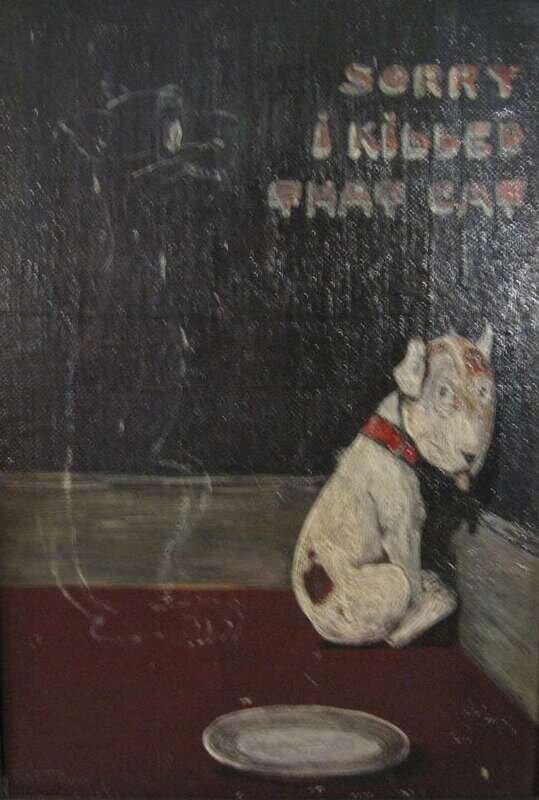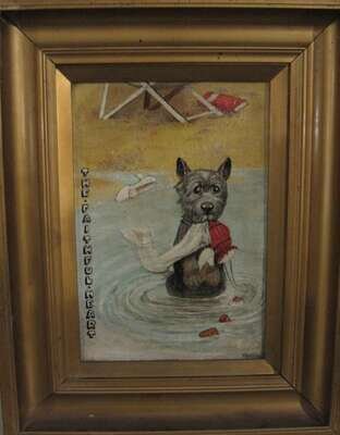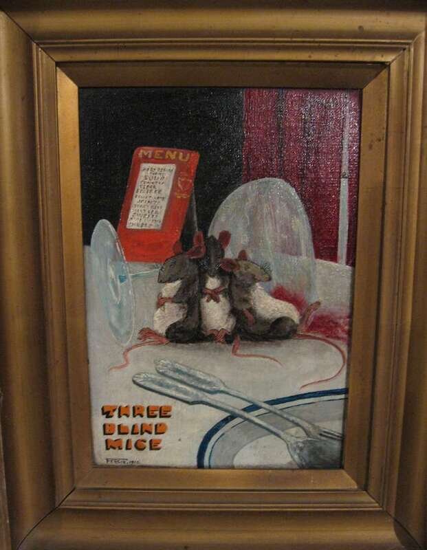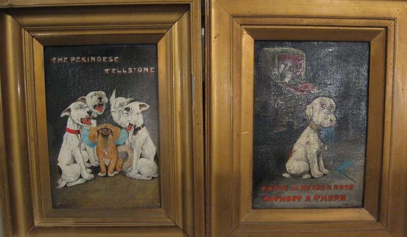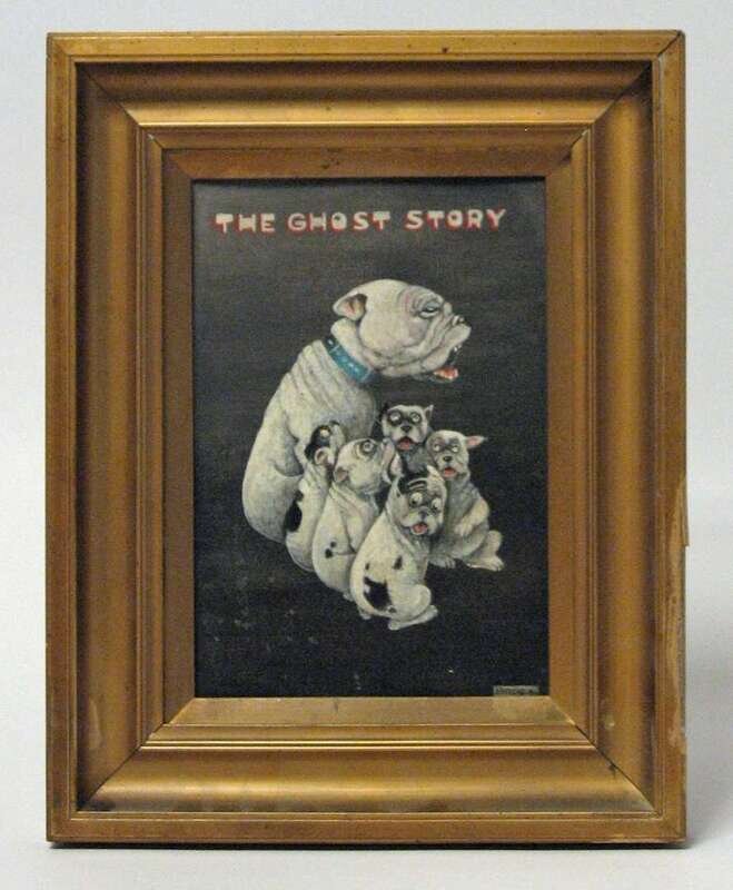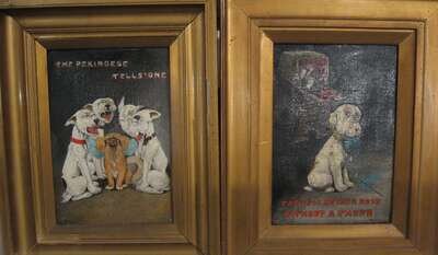 Seven depicting amusing scenes with dogs, the eighth of drunken mice, oil on canvase, framed. (8).