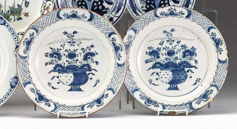 Each centrally painted with a flower filled urn within a lattice and foliate reserve border with ochre banding to edge. (2).
