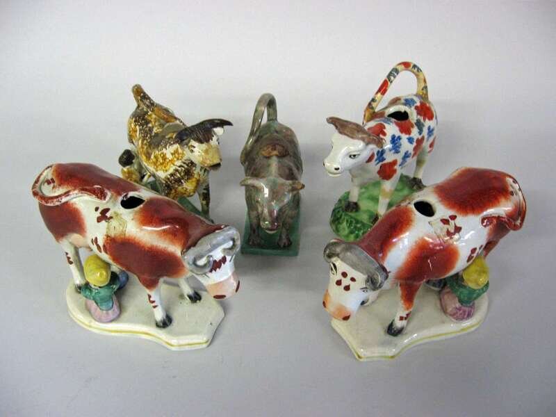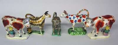 Comprising of a pair with a seated milk maid, an example with a spotted coat, an example with a milk maid and striated coat, and a mottled glazed example. (5).