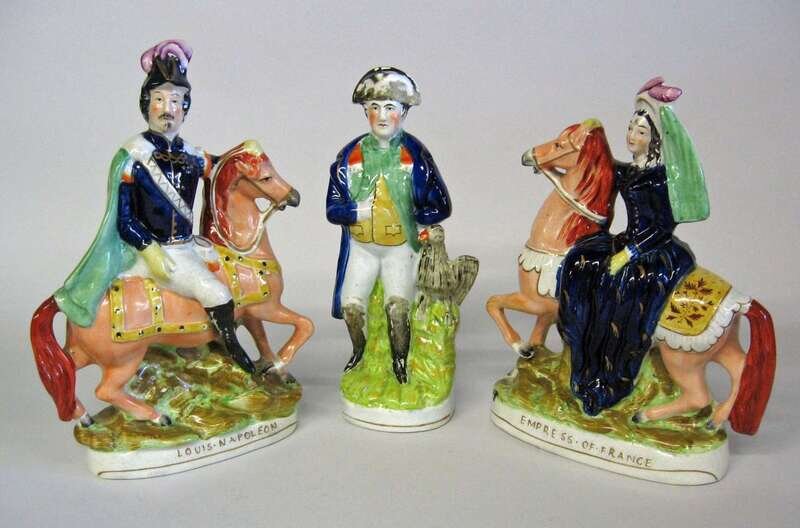 Comprising a pair of equestrian figures titled 'Louis Napoleon' & 'Empress of France', and a standing figure of Napoleon. (3).