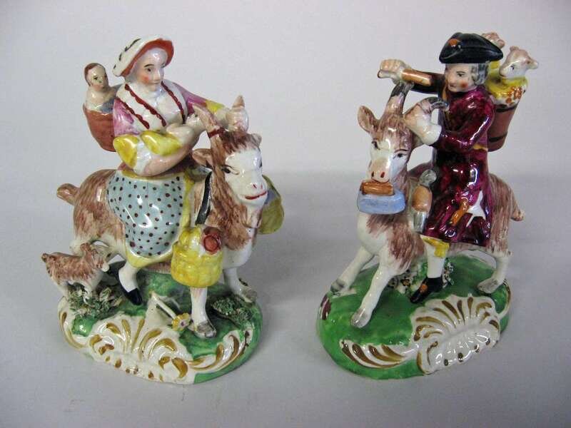 Pair of Staffordshire figures mother of three & tailor on a goat, mid 19th century