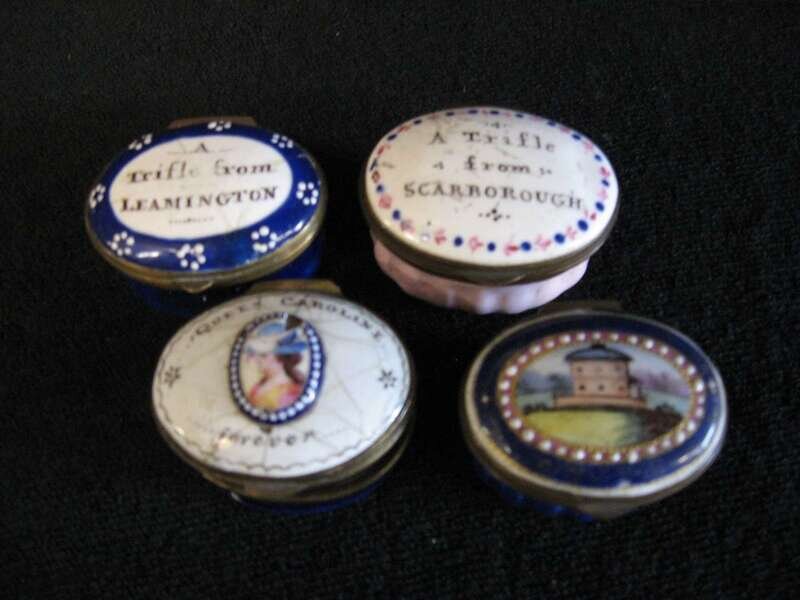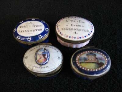 Comprising three on blue enamel grounds, one on a pink enamel ground, with various mottos or scenes. (4).