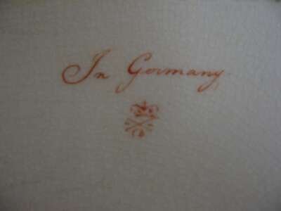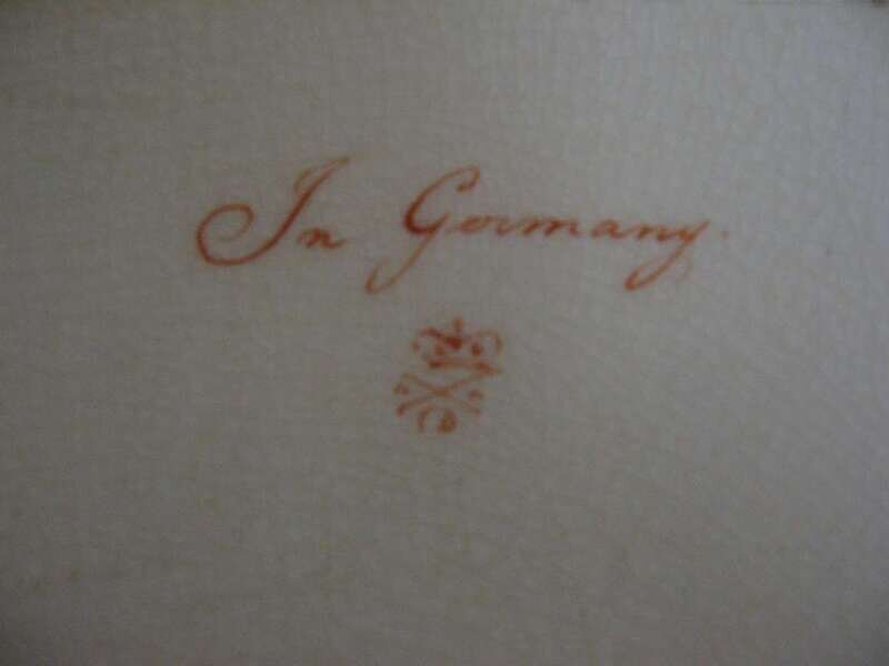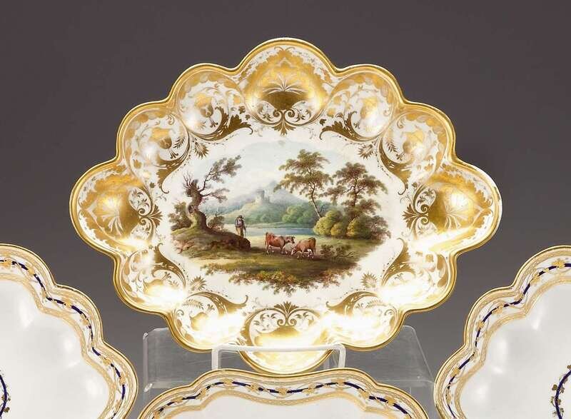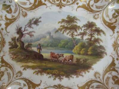 Of shaped oval form, centrally painted with a figure and cows in a landscape, the lobed panels with rich gilt decoration, the reverse labeled 'In Germany', red crowned D mark.