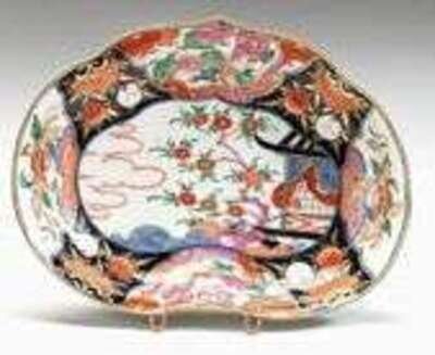 Of kidney form in the 'Pavilion' pattern, the central reserve depicting a pavilion, prunus tree and clouds, the border with alternating foliate and dragon panels, with gilt highlights.