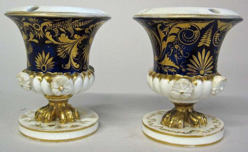 Each of campana form, gilt details, raised on paw feet and a circular base, lacking covers.