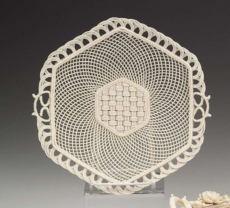 Of hexagonal form with a basket weave center enclosed by interlaced spiraling bands within a looped border with twin branch form handles, impressed 'BELLEEK' and 'IRELAND'.