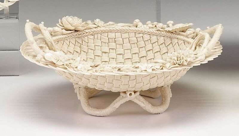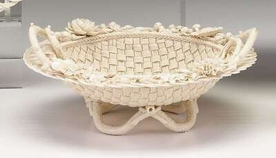 Having a basket weave center bowl with an interlaced border applied with various flowers and branch form handles, impressed 'BELLEEK' and 'IRELAND'.
