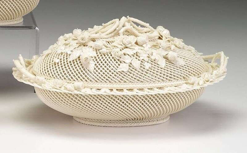 Of oval form with a latticework body and interlaced loop border applied with roses, thistles and shamrocks and with twin branch-form handles, the cover similarly decorated, impressed 'BELLEEK' and 'IRELAND'.