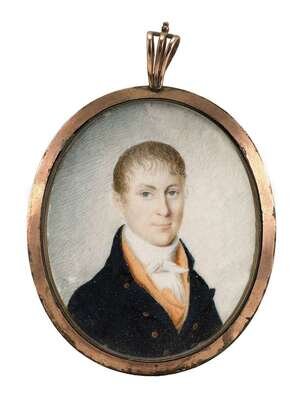Watercolor on ivory, unsigned, depicting a young man with blonde hair and wearing a dark jacket and pale orange waistcoat, in a gilt metal oval frame, the reverse enclosing a lock of hair set with three seed pearls.