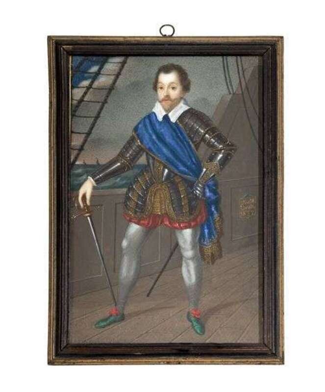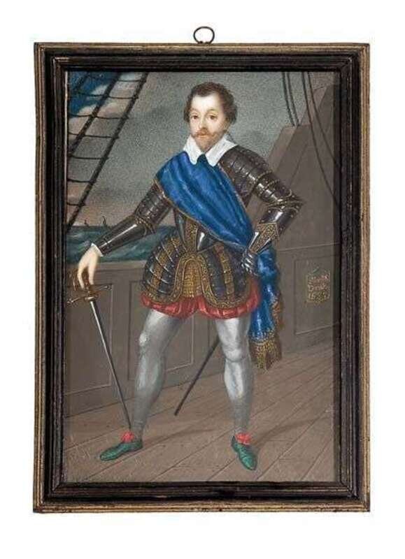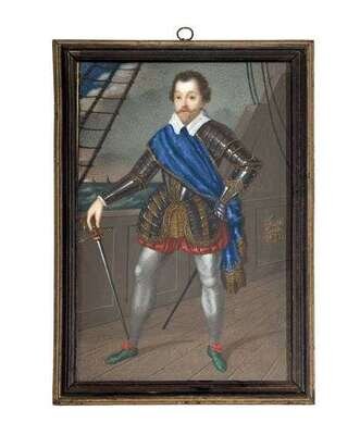 Unsigned, watercolor and gouache on vellum, shown full figure, the subject wearing a partial suit of armor and blue sash and gray leggings, standing on the deck of a ship, his hand resting on his drawn sword, with 'Sir F. Drake / 1587' in a small cartouche.