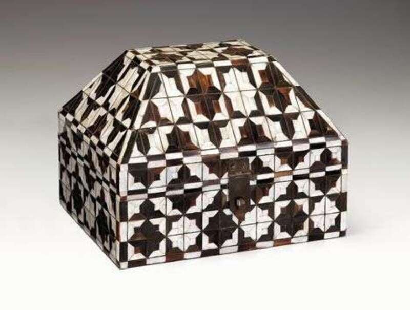 Having a flattened peaked lid, the exterior covered with mother-of-pearl and horn parquetry.