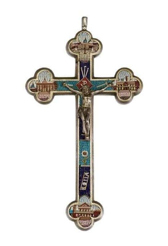 The cross inset with four quatreform views of Rome and centered by a silver figure of Christ, the reverse inscribed 'Roma' and dated 1899.