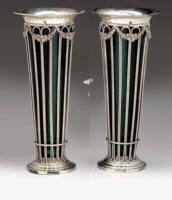 Of trumpet form with floral swags beneath flared mouths, with green glass liners.
