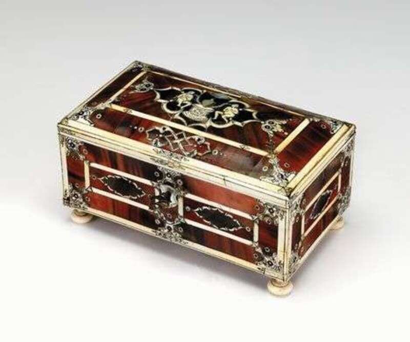 The horn panels banded by ivory and centered by cartouches, the cover with figures flanking a mother-of-pearl heart inscribed '1745' below, on flattened ivory bun feet.