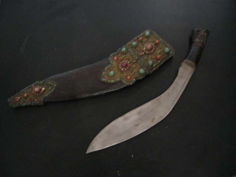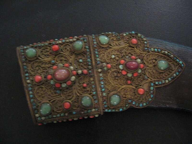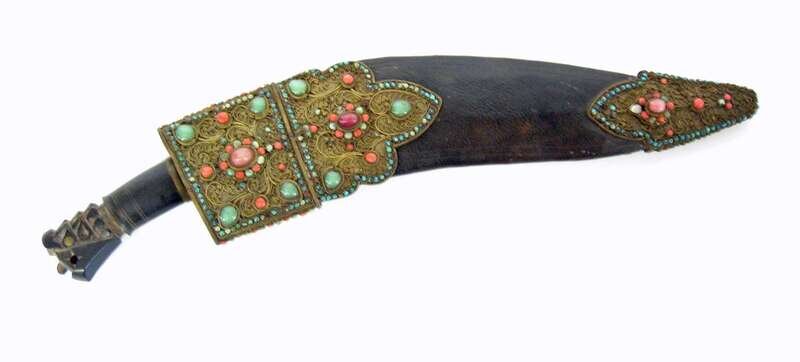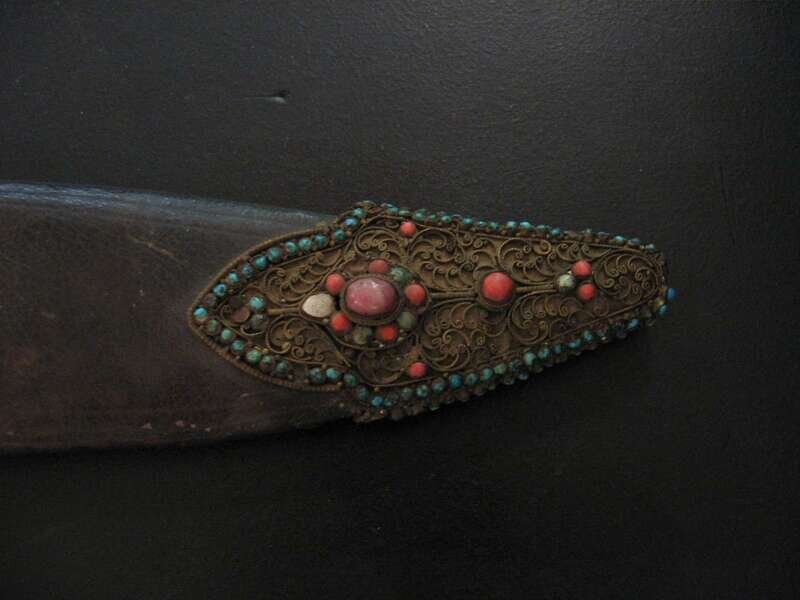 The leather scabbard decorated with filigree and inset with coral, turquoise, jade and other semi-precious stones.