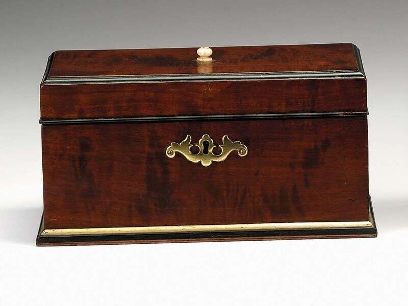 Of rectangular form with ebonized and brass moldings and winged brass escutcheon, the lid with an ivory ball finial, opening to a compartmented interior comprising three removeable lidded mahogany tea containers.