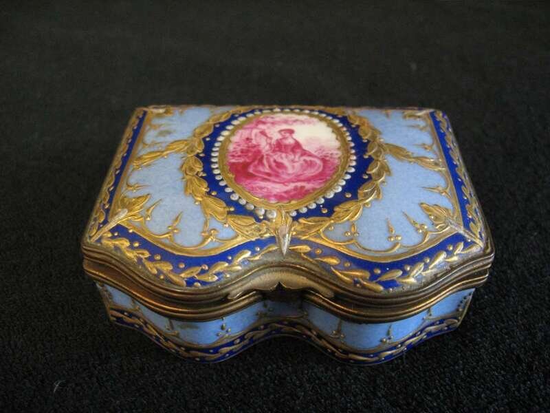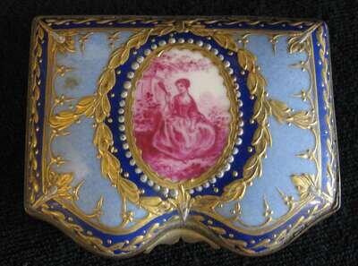 Having a serpentine front, the hingedlid centrally painted in puce with an oval reserve depicting a lady seated in a garden, set within cobalt and gilt laurel bands on a pale blue ground.