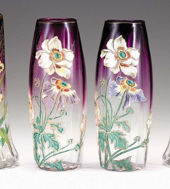Of elongated oval form, the glass from amethyst to clear and decorated in enamels with poppies. (2).