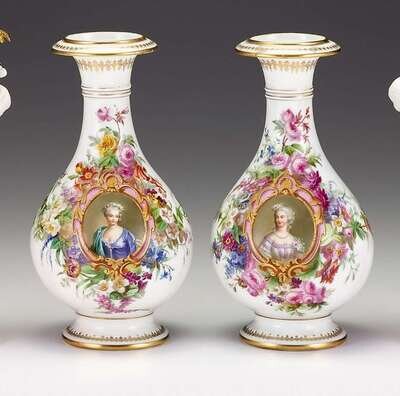 Each of squat ovoid form, decorated with a portrait medallion depicting a lady of the court, surrounded by foliate sprays, gilt details.