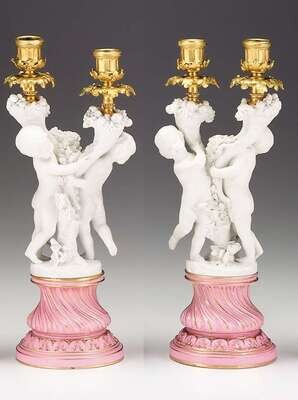 Modeled as bisque porcelain dancing cherubs holding aloft twin gilt bronze candle arms, on a twisted pink porcelain base, blue marks. (2).
