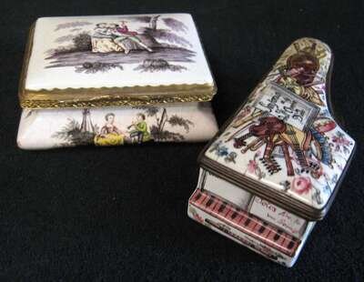 One of bombe form decorated with courting couples, the other of piano form decorated with musical devices.