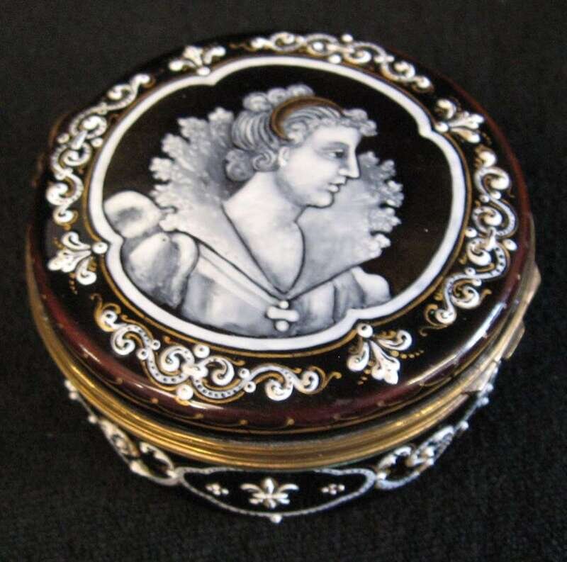 Decorated with a profile portrait of a maiden in 17th century costume, on an oxblood ground.
