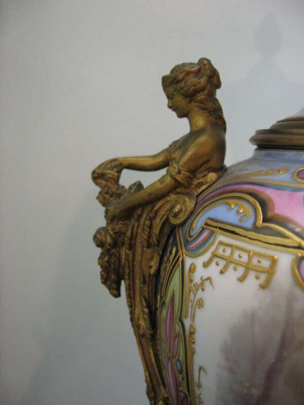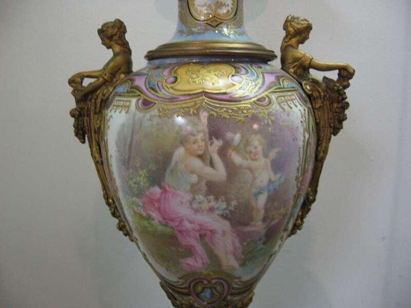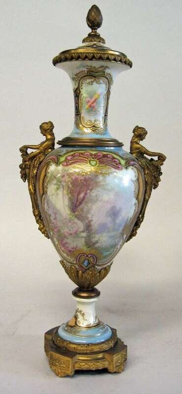 The cover with an acorn finial, the body painted with Cupid holding a mirror for a young beauty, the reverse with a landscape view, against an opalescent pale blue ground, the twin gilt metal handles in the form of draped females holding floral baskets, on a gilt metal mounted socle base.