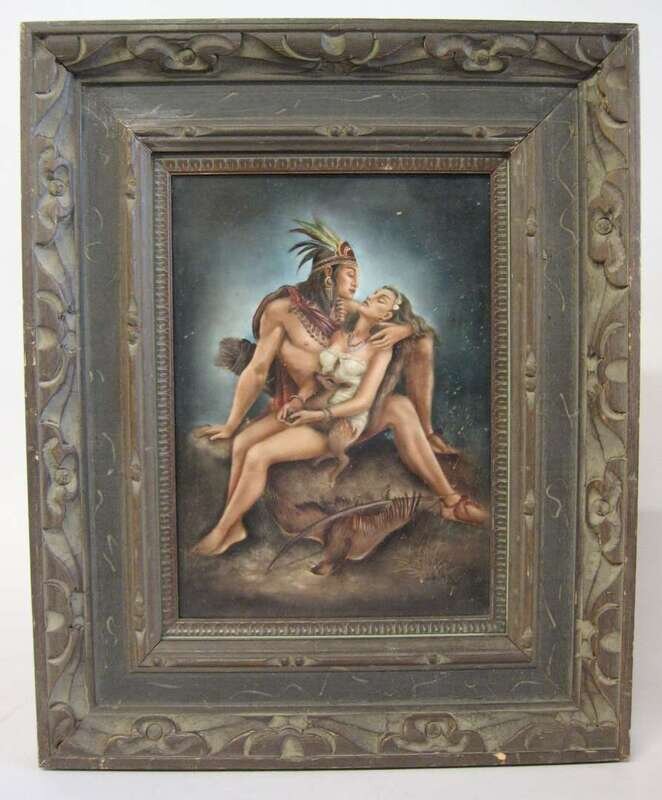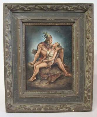 Depicting a Native American chief and female attendant, signature unclear, spurious impressed KPM and sceptre mark, framed.