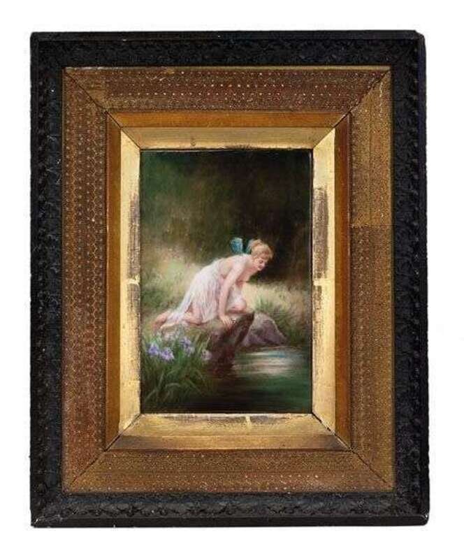 Depicting a winged nymph by a pool, gazing at her reflection, impressed KPM and sceptre marks, framed.