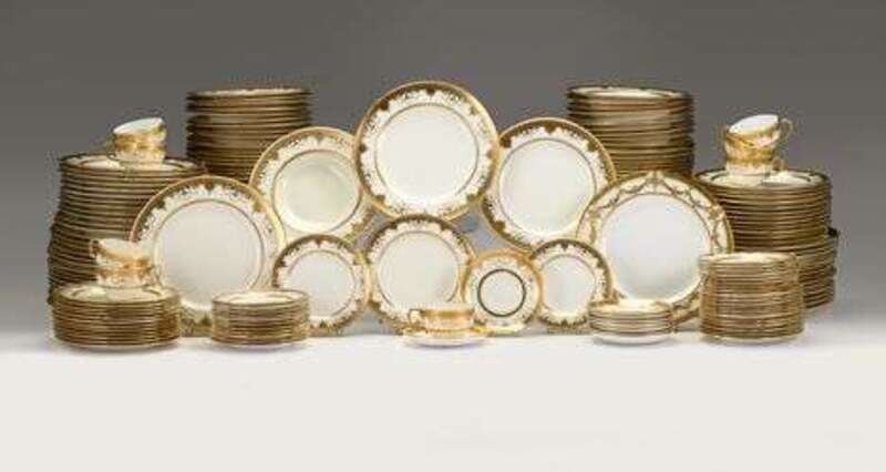 In the Neoclassical taste with tooled gilt border in a guilloche pattern with fleur-de-lys and beaded swag motif, factory and retailer's mark in underglaze puce, shape numbers in overglaze orange, comprising: 41 soup plates, 33 dinner plates, 12 dinner plates, 15 luncheon plates, 13 salad plates, 32 bread plates, 8 teacups, 9 saucers. (161 pieces).
