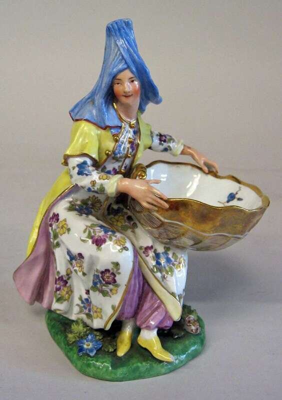 In the form of a seated woman holding a shell in her lap dressed in flowing robes, gilt details.