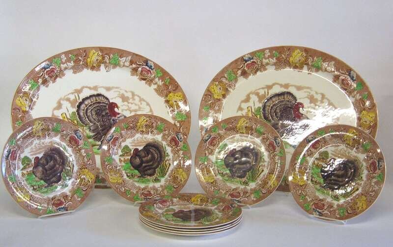 In the 'Turkey' pattern, comprising a pair of oval meat platters and eight dinner plates. (10).