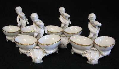 Each depicting a winged infant seated above a pair of open basins, raised on a molded shell base, gilt details.