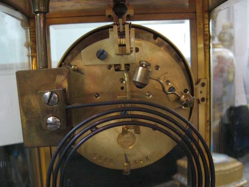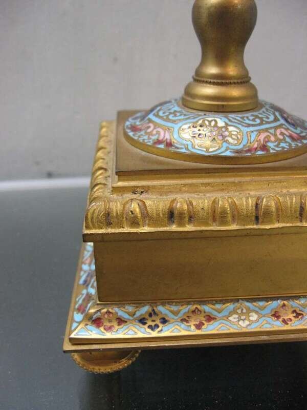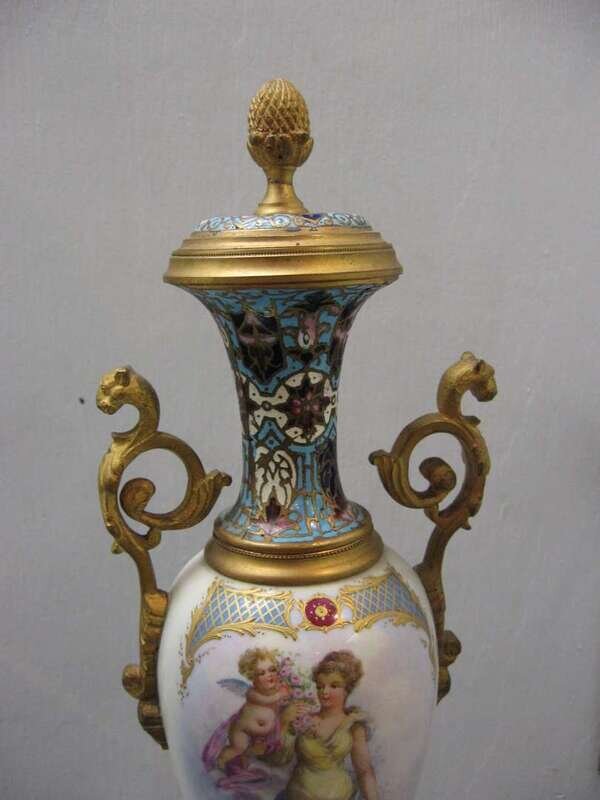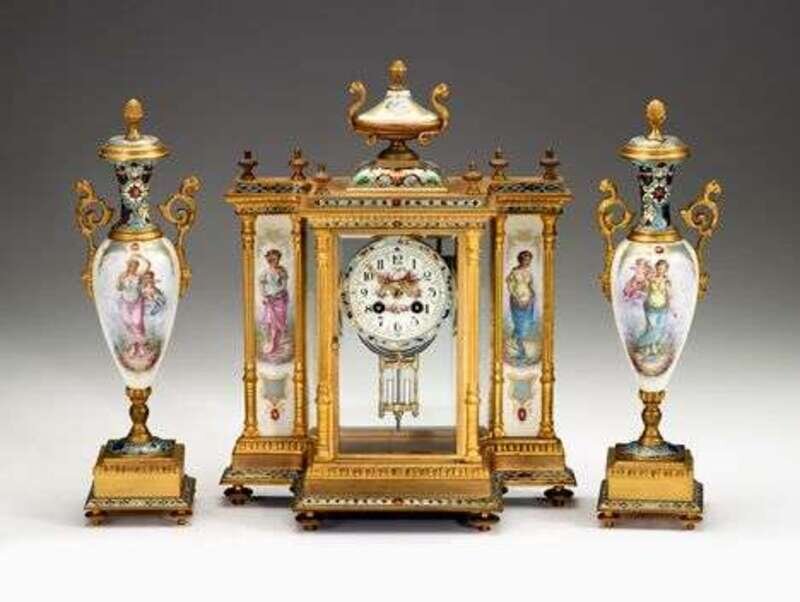French gilt-bronze, porcelain and champleve three-piece clock garniture circa 1900