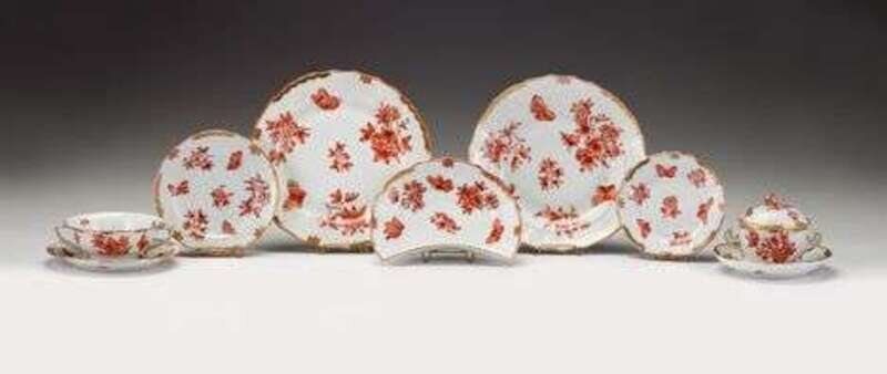 Pattern VBOM, comprising 2 dinner plates, 11 side plates, 12 soup bowls, 14 crescent shaped salad plates, 10 covered bouillon cups, 12 saucers, two cream soup bowls and underplates, 3 dessert plates, and a bread & butter plate, blue printed mark. (69).