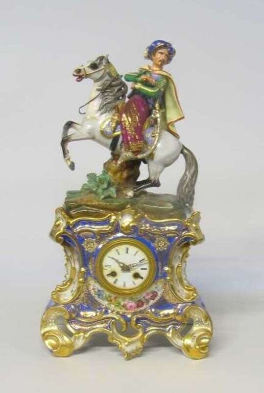 The rococo revival base with reserves painted with floral swags and bouquets and 'jeweled' enamel decoration against a blue gilt enhanced ground, surmounted by a figure of a Turk on horseback, the base marked 'Medailles d'or 1844 / F.R. Brevete / Fournisseur du Roi'.